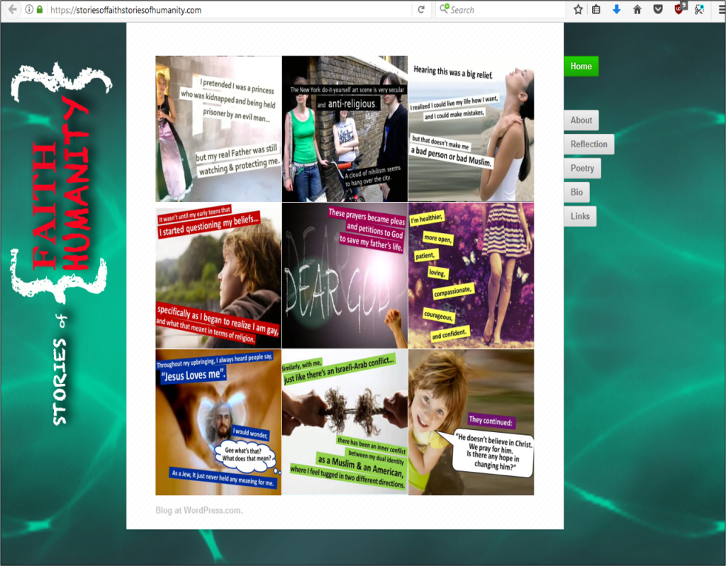 STORIES OF FAITH | STORIES OF HUMANITY is an arts-based phenomenological research project about the lived experiences of faith across diverse religious and spiritual affiliations. I transformed participants’ interviews into digital stories as “gifts of empathy” to facilitate interfaith dialogue and solidarity.